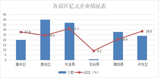 分縣區(qū)看,6個(gè)縣區(qū)均有億元以上企業(yè),其中,貴池區(qū)40家,東至縣37家,青陽(yáng)縣28家,開(kāi)發(fā)區(qū)24家,集中區(qū)20家,石臺(tái)縣1家。分地區(qū)億元企業(yè)數(shù)量占比看,東至縣和開(kāi)發(fā)區(qū)較高,分別為31.1%和28.6%。石臺(tái)縣占比最低,為9.1%。