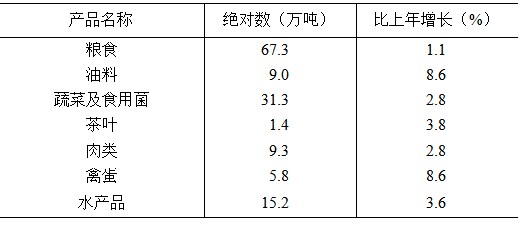 全年糧食產(chǎn)量67.3萬噸,比上年增長(zhǎng)1.1%;油料產(chǎn)量9萬噸,增長(zhǎng)8.6%;蔬菜及食用菌產(chǎn)量31.3萬噸,增長(zhǎng)2.8%;茶葉產(chǎn)量1.4萬噸,增長(zhǎng)3.8%。肉類總產(chǎn)量9.3萬噸,增長(zhǎng)2.8%;其中,豬肉產(chǎn)量5.2萬噸,增長(zhǎng)4.7%;禽肉產(chǎn)量4萬噸,增長(zhǎng)0.4%。禽蛋產(chǎn)量5.8萬噸,增長(zhǎng)8.6%;水產(chǎn)品產(chǎn)量15.2萬噸,增長(zhǎng)3.6%。