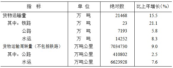 全年旅客運(yùn)輸量1409萬人,比上年增長(zhǎng)82%;貨物運(yùn)輸量21468萬噸,增長(zhǎng)15.5%。旅客運(yùn)輸周轉(zhuǎn)量(不包括鐵路)28912萬人公里,增長(zhǎng)40.5%;貨物運(yùn)輸周轉(zhuǎn)量(不包括鐵路)7034730萬噸公里,增長(zhǎng)9%。港口貨物吞吐量14347.2萬噸,增長(zhǎng)9.8%,其中外貿(mào)貨物吞吐量17.2萬噸,下降19.2%。港口集裝箱吞吐量19199標(biāo)準(zhǔn)箱(TEU),增長(zhǎng)54.6%。