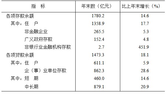 年末全市金融機(jī)構(gòu)本外幣各項(xiàng)存款余額1780.2億元,比上年末增長(zhǎng)14.6%,比年初增加226.9億元。其中,住戶存款余額1358.9億元,增長(zhǎng)17.7%;非金融企業(yè)存款余額265.5億元,增長(zhǎng)5.3%。金融機(jī)構(gòu)本外幣各項(xiàng)貸款余額1473.3億元,增長(zhǎng)18.1%,比年初增加225.7億元。其中,短期貸款余額460億元,增長(zhǎng)14.6%,中長(zhǎng)期貸款余額879.1億元,增長(zhǎng)20.9%。