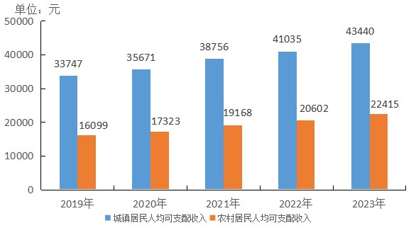 2019—2023年全市城、鄉(xiāng)居民人均可支配收入