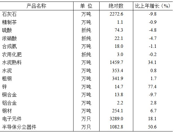 規(guī)模以上工業(yè)統(tǒng)計(jì)的主要產(chǎn)品中,水泥、粗鋼、鋅、電子元件、半導(dǎo)體分立器件分別比上年增長(zhǎng)0.8%、1.7%、77.4%、18.1%、50.6%,石灰石、硫酸、合成氨、銅合金分別下降9.8%、4.8%、1.1%、9.7%。