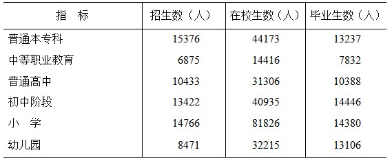 年末全市共有普通高等教育學(xué)校3所,普通本??圃谛W(xué)生44173人,成人在校學(xué)生12271人。中等職業(yè)教育學(xué)校5所,在校學(xué)生14416人。普通中學(xué)94所,在校學(xué)生72241人。其中,高中在校學(xué)生31306人,高中階段毛入學(xué)率98.9%;初中在校學(xué)生40935人,初中學(xué)齡人口毛入學(xué)率102.7%。小學(xué)145所,在校學(xué)生81826人,小學(xué)毛入學(xué)率102.4%。