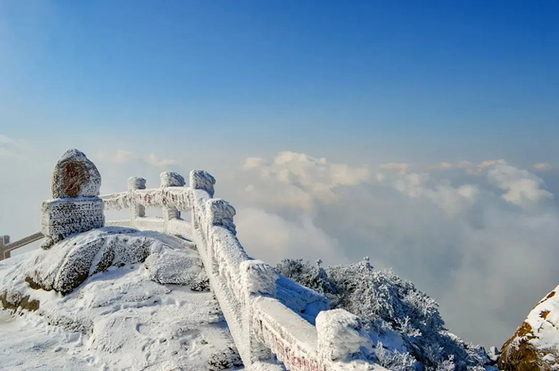 乘纜車上行,一路上,仿佛置身于一個(gè)琉璃世界。被雪漂過(guò)的天空藍(lán)透了,干凈得不帶一點(diǎn)塵色,白云了無(wú)痕跡。山峰、峭壁、深林開(kāi)在碩大的冰花里,如一個(gè)個(gè)神圣莊嚴(yán)的蓮花寶座。俯瞰下去,萬(wàn)千林海冰花凝結(jié),仿佛《冰雪奇緣》中的奇妙場(chǎng)景就在眼前上演。