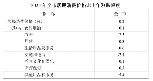 全年居民消費(fèi)價(jià)格比上年上漲0.2%。分類別看,食品煙酒、衣著、居住、生活用品及服務(wù)、教育文化和娛樂、醫(yī)療保健、其他用品和服務(wù)等價(jià)格分別上漲0.1%、2.5%、0.3%、0.6%、0.1%、0.3%、5.4%;交通和通信價(jià)格下降2.1%。