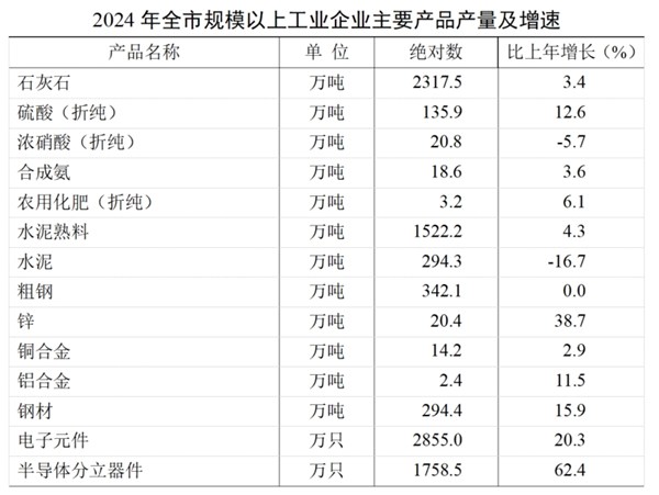 規(guī)模以上工業(yè)統(tǒng)計(jì)的主要產(chǎn)品中,石灰石、硫酸、合成氨、鋅、銅合金、電子元件、半導(dǎo)體分立器件產(chǎn)量分別比上年增長3.4%、12.6%、3.6%、38.7%、2.9%、20.3%、62.4%,水泥產(chǎn)量下降16.7%。