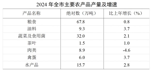 全年糧食產(chǎn)量67.8萬噸,比上年增長0.8%;油料產(chǎn)量9.3萬噸,增長3.7%;蔬菜及食用菌產(chǎn)量32萬噸,增長2.1%;茶葉產(chǎn)量1.5萬噸,增長1%。肉類總產(chǎn)量8.9萬噸,下降4.6%;其中,豬肉產(chǎn)量4.8萬噸,下降9.2%;禽肉產(chǎn)量4萬噸,增長1%。禽蛋產(chǎn)量6萬噸,增長3.7%;水產(chǎn)品產(chǎn)量15.7萬噸,增長2.8%。