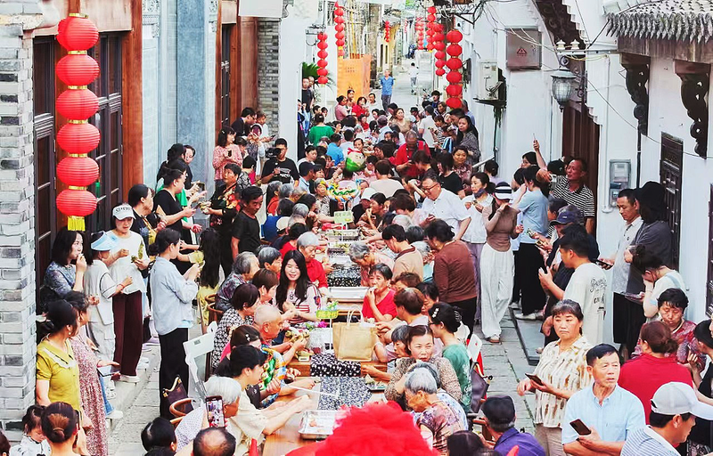 夕陽余暉灑在古樸的老街上,煙火氣在街巷間緩緩升騰。老街民宿廚房里,水汽彌漫,一籠籠美食香氣四溢;十字路口處,小型舞臺搭建完畢,十幾張長桌首尾相連、一字排開。隨著旱船燈表演的鑼鼓聲響起,居民們從四面八方趕來,圍坐長桌拉家常,等待開席。看到參與人數(shù)越來越多,池州市飛地文化發(fā)展有限公司負(fù)責(zé)人胡倩趕忙安排人手添加桌椅。