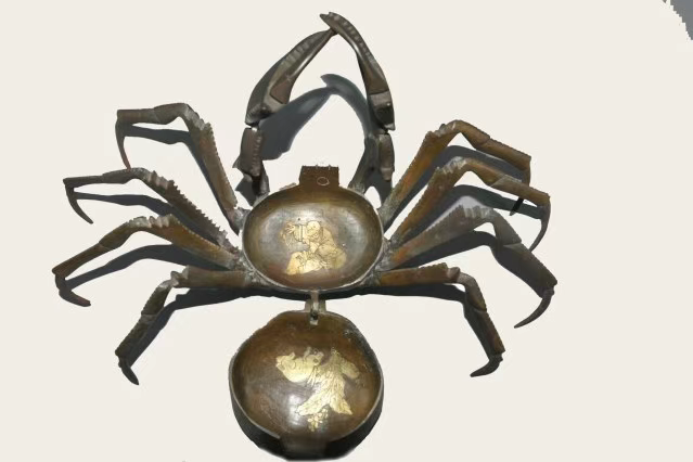 “能把銅蟹做得這么“活”,靠的是中國傳統(tǒng)的鏨刻技藝?!蓖魝髦医榻B說,這種用鏨子、錘子在金屬上“畫畫”的手工技藝,早在商朝三星堆金杖上就有了,唐朝鏨花金執(zhí)壺、清朝金甌永固杯都是使用這項手藝的“巔峰之作”。但要論“題材”,多數(shù)鏨刻文物是瓶、壺、首飾,這兩只銅蟹以“活物”為造型,還能做成分體開合的,卻格外少見。