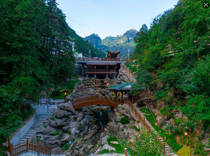 下行至谷底,一座藤蔓纏繞的木拱橋靜臥清溪之上,名曰問仙橋。橋身不施一釘,榫卯相銜,橋下溪水清澈見底,棕紅色的彩石在水流沖刷下泛著玉質(zhì)光澤。初冬水溫更涼,指尖一觸,寒意便順著脈管攀上來,卻也把谷中萬物的輪廓洗得更加分明——巖壁的紋理、石面的光澤、水紋的走向,在清冷里一一顯露,那是內(nèi)斂的鋒芒。