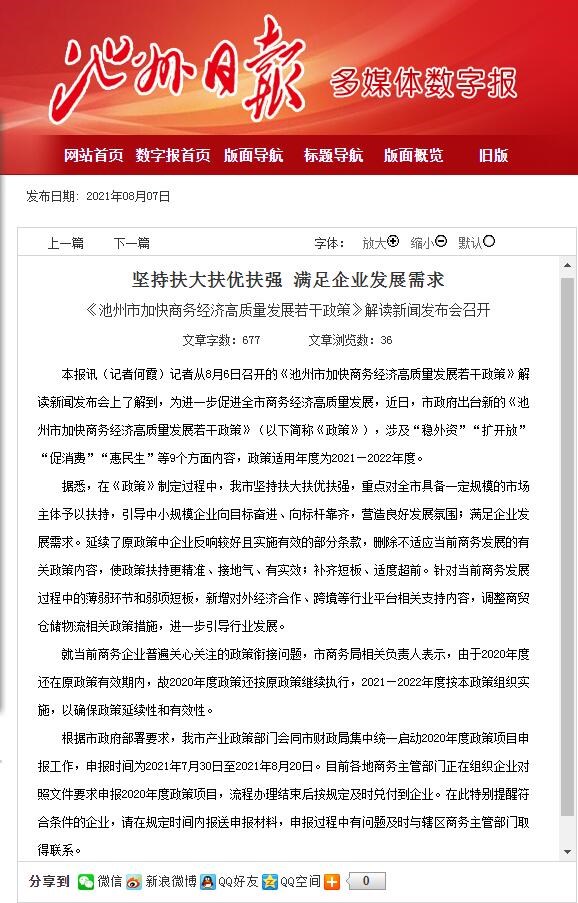 本報(bào)訊(記者何霞)記者從8月6日召開的《池州市加快商務(wù)經(jīng)濟(jì)高質(zhì)量發(fā)展若干政策》解讀新聞發(fā)布會(huì)上了解到,為進(jìn)一步促進(jìn)全市商務(wù)經(jīng)濟(jì)高質(zhì)量發(fā)展,近日,市政府出臺新的《池州市加快商務(wù)經(jīng)濟(jì)高質(zhì)量發(fā)展若干政策》(以下簡稱《政策》),涉及“穩(wěn)外資”“擴(kuò)開放”“促消費(fèi)”“惠民生”等9個(gè)方面內(nèi)容,政策適用年度為2021—2022年度。