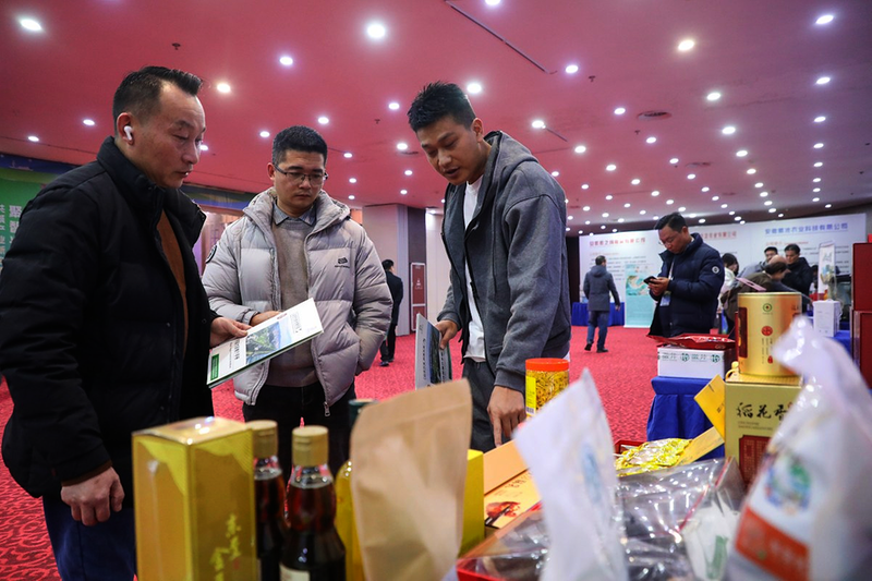 圖為鱖魚和農(nóng)特產(chǎn)展區(qū)工作人員向與會(huì)嘉賓介紹產(chǎn)品。記者 張延鶴 攝