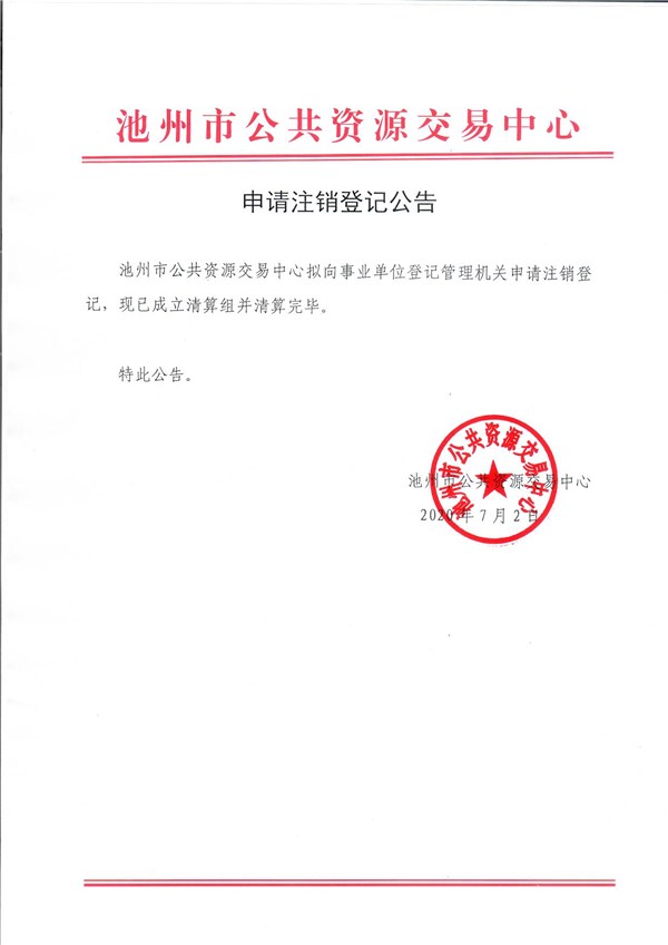 標題: 申請注銷登記公告(池州市公共資源交易中心) 文號: