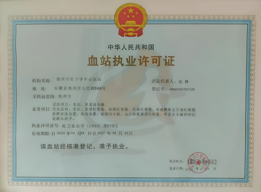 一、機(jī)構(gòu)名稱:池州市紅十字中心血站