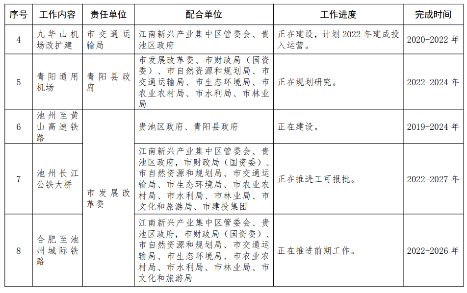 1.建設(shè)“五山”聯(lián)動“快進”交通網(wǎng)。依托軌道交通、高速公路、民航等構(gòu)建“快進”交通網(wǎng)絡(luò),提高旅游目的地的通達性和便捷性,實施G3W德上高速池州段,謀劃建設(shè)池州至宣城、青陽經(jīng)石臺至東至高速公路;實施池州至黃山高速鐵路建設(shè),加快推進池州長江公鐵大橋、合肥至池州城際前期工作;實施九華山機場改擴建,加快推進青陽通用機場前期工作,完善皖南地區(qū)“快進”旅游交通基礎(chǔ)設(shè)施網(wǎng)絡(luò)?!藏?zé)任單位:各縣區(qū)政府,江南新興產(chǎn)業(yè)集中區(qū)、九華山風(fēng)景區(qū)管委會,市發(fā)展改革委、市財政局(國資委)、市自然資源和規(guī)劃局、市生態(tài)環(huán)境局、市交通運輸局、市農(nóng)業(yè)農(nóng)村局、市水利局、市林業(yè)局、市建投集團按職責(zé)分工負(fù)責(zé)〕